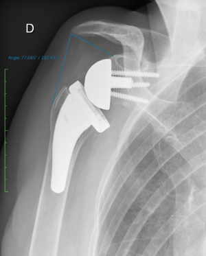 - ↑ 60.0 60.1 Zitkovsky HS, Carducci MP, Mahendraraj KA, Grubhofer F, Jawa A. Lateralization and Decreased Neck-Shaft Angle Reduces Scapular Notching and Heterotopic Ossification. J Am Acad Orthop Surg. 2020 Apr 8. doi: 10.5435/JAAOS-D-19-00808. Online ahead of print.