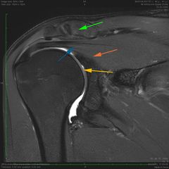 Sagittal magnetic resonance imaging (MRI) T2 fat saturation view of a right subcoracoid space, the coracoid process (green arrow) defines the superior border, the conjoint tendon (yellow arrow) form the anterior border, the glenoid (blue arrow) and the middle glenohumeral ligament (red arrow) serve as the posterior border.