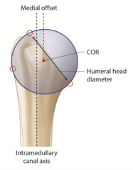 Illustration of a right non-arthritic humeral head. The humeral head diameter, the center of rotation (COR), the intramedullary canal axis and the medial offset (distance between the intramedullary canal axis and the COR) are represented.