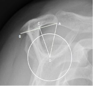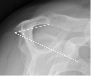 In 1995, Banas et al. introduce the notion of the lateral acromion angle (Figure).[43] In this study, measurements are performed on magnetic resonance imaging coronal sections. It is demonstrated that a low lateral acromion angle is significantly associated with a lesion of the cuff at magnetic resonance imaging with in particular a limit below 70 degrees which would be an indicator for an anterolateral decompression of the acromion. These results are confirmed by a more recent study based this time on standard radiographs of the face.[33] It is also shown that below the threshold of 70 degrees, the lesion of the cuff is constant. Thus this measure could help to guide the therapeutic attitude without complementary exams and help the surgeon in the decision process.