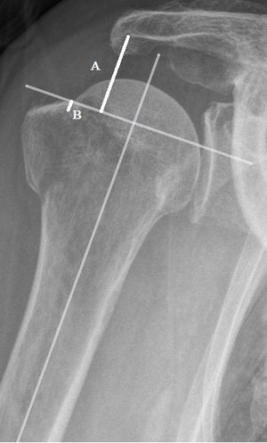 X-Ray showing greater tuberosity fracture in an old lady treated conservatively. The ratio is calculated using a line along the center of the humeral shaft. A perpendicular line to this axis is drawn tangent to the most superior aspect of the great tuberosity. Distance B is measured from this line to the lateral aspect of the articular surface of the humeral and a distance A from the line to the acromion. Ratio = (A + B)/ B. A ratio greater than 0.5 represent a displaced fracture.