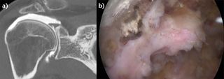 A coronal view of a right shoulder computed tomography (CT) arthrogram shows a probable B2 rotator cuff lesion with a Patte 3 retraction. b) The arthroscopic view through lateral portal revealed after partial debridement that the tendon was not retracted but actually had adhered under the acromion. Reproduced from Lädermann et al.,28 with permission.