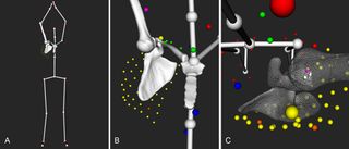 (A) Abduction simulation obtained from shoulder’s CT reconstruction and optical motion capture, (B) and (C) show a zoom in the shoulder (front and top views). In image (C), we clearly observe an anterior translation (arrow) of the humeral head center (pink sphere) with respect to the glenoid center (white sphere). Note that the clavicle is not shown for clarity. Reproduced from Lädermann et al., with permission.