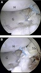 Left shoulder, anterosuperolateral viewing portal, showing completed arthroscopic Bankart repair augmented with a split subscapularis flap in the setting of capsulolabral deficiency. (A) Completed repair showing restoration of anterior soft tissue by use of the split subscapularis tendon (SSc) flap. (B) The split between the subscapularis (arrow) is visualized anterior to the flap that has undergone tenodesis. (G, glenoid; H, humeral head.). Reproduced from Denard et al., with permission.