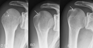 Radiological signs found on X-rays. Images showing bone cysts (short white arrows) or condensation (long white arrows) or on the greater tubercle and glenoid rim, indicating a previous posterosuperior impingement. From Pesquer L, Poussange N, Moreau-Durieux M-H, et al. Le conflit postéro-supérieur de l’épaule. Journal de Radiologie Diagnostique et Interventionnelle 2017;98:296-302, with permission.