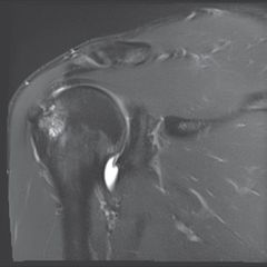 Coronal magnetic resonance arthrography (MRA) view showing bony contusion on the greater tubercle caused by repeated impingement, as well as cysts and a partial-thickness articular rotator cuff lesion.