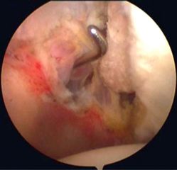 Glenoidplasty Arthroscopic view of a right shoulder through an anterolateral portal. Bone spicules on the posterosuperior glenoid rim.