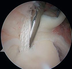 Arthroscopic SLAP II repair (right shoulder) using the posterior approach (soft point) and knotless anchors. f) Placing the anchor (knotless) to fix the tear backwards.