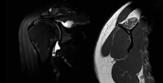 Left: MRA coronal view with T2 sequences revealing a large spinoglenoid cyst. Right: MRI sagittal view of the same patient with T1 sequences of a fatty infiltrated supraspinatus.